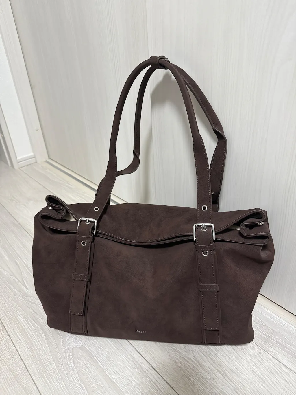 - 製品の表面にバックルストラップディテールでストラップの長さ調節可能